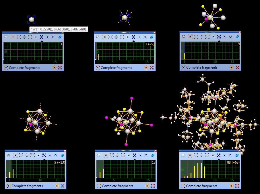wheel changes a property each. The modes and the properties changed are the following: The wheeling modes "Pump up or shrink", "Expand via contacts", and "Molecule cluster" are demonstrated below. The wheeling mode "Expand selection" is described in the article "Selecting objects". The wheeling modes "Atom radii" and "Bond radii" are described in the articles "Designing atoms" and "Designing bonds and contacts". The usage of the mouse wheel to change the enlargement factor or to zoom in or out is described in the article "Grab mode". Pump up or shrinkThe "Pump up or shrink" wheeling mode adds/removes atoms of the n-th sphere around selected atom, while stepping via broken-off bonds. As an example we use the document COD-10004001.diamdoc: We start with a single atom of the parameter list, that is the first one: "W1", and complete the molecule step-by-step then expand via contacts and H-bonds to neighbouring molecules' atoms and continue with step-by-step building up...