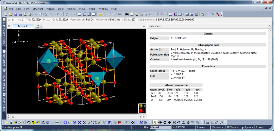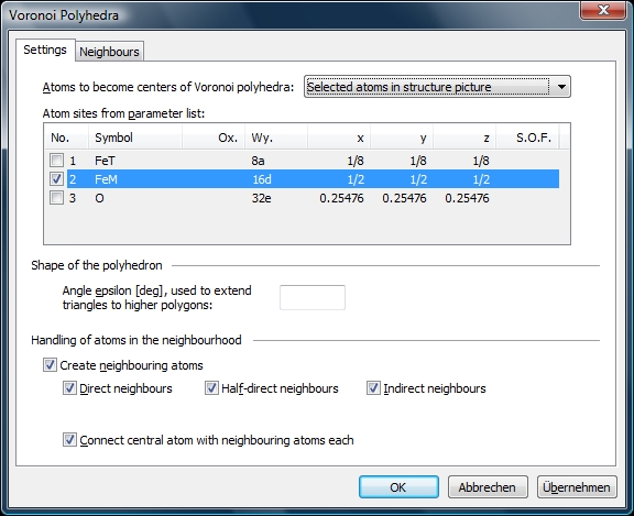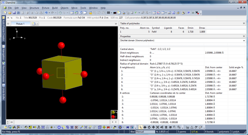 Previous article: Modification and duplication of polyhedra You should also read or have read this closely related article: Dirichlet Domains Sample #1: Magnetite The first sample of this article will use magnetite from COD:9013529, so open the sample file "COD-9013529.diamdoc". The data sheet shows us three atom sites in the atomic parameter list: "FeT", "FeM", and "O".