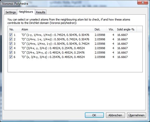 The second page shows the list of neighbouring atoms for the site that is selected or checked in the atom site list of the first page or (has been selected in the structure picture). Here the Dirichlet domain looks straightforward simple, six equidistant Fe--O distances of 2.06 Angstroms, leading to a regular cube with four vertices for the six faces each and a solid angle of 1/6 (or 16 2/3 percent).
