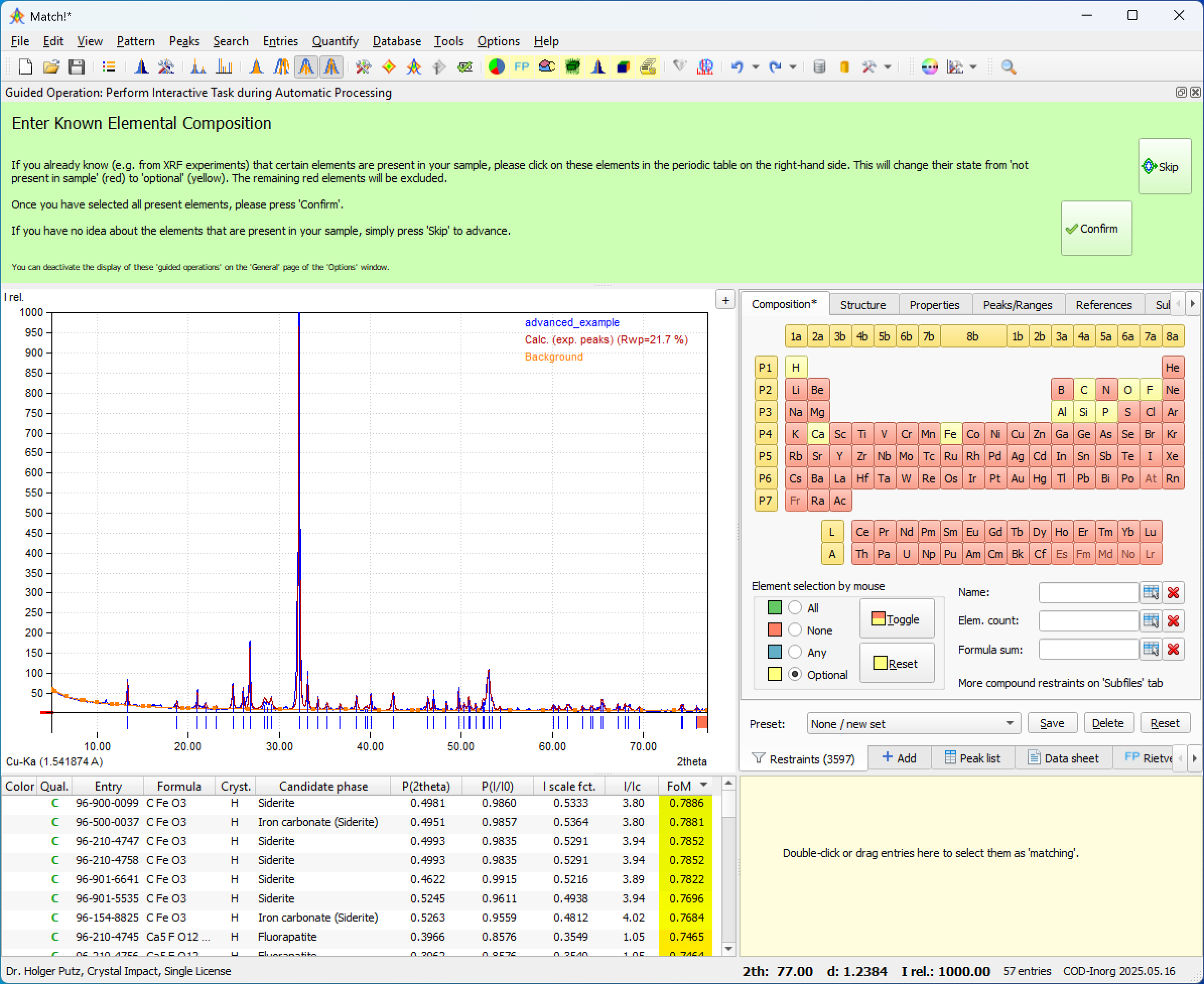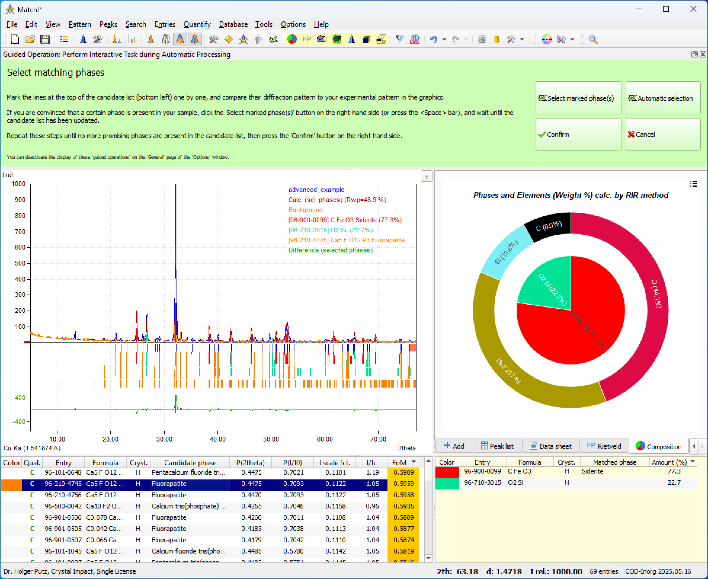 If Match! cannot perform the desired task completely on its own (like the selection of restraints or matching phases), the user is given detailed instructions for the operations required ("guided operations") in a new area with light-green background at the top, and is then asked to manually accomplish the task. The user finally indicates the completion of the task by pressing a corresponding "Confirm" button.