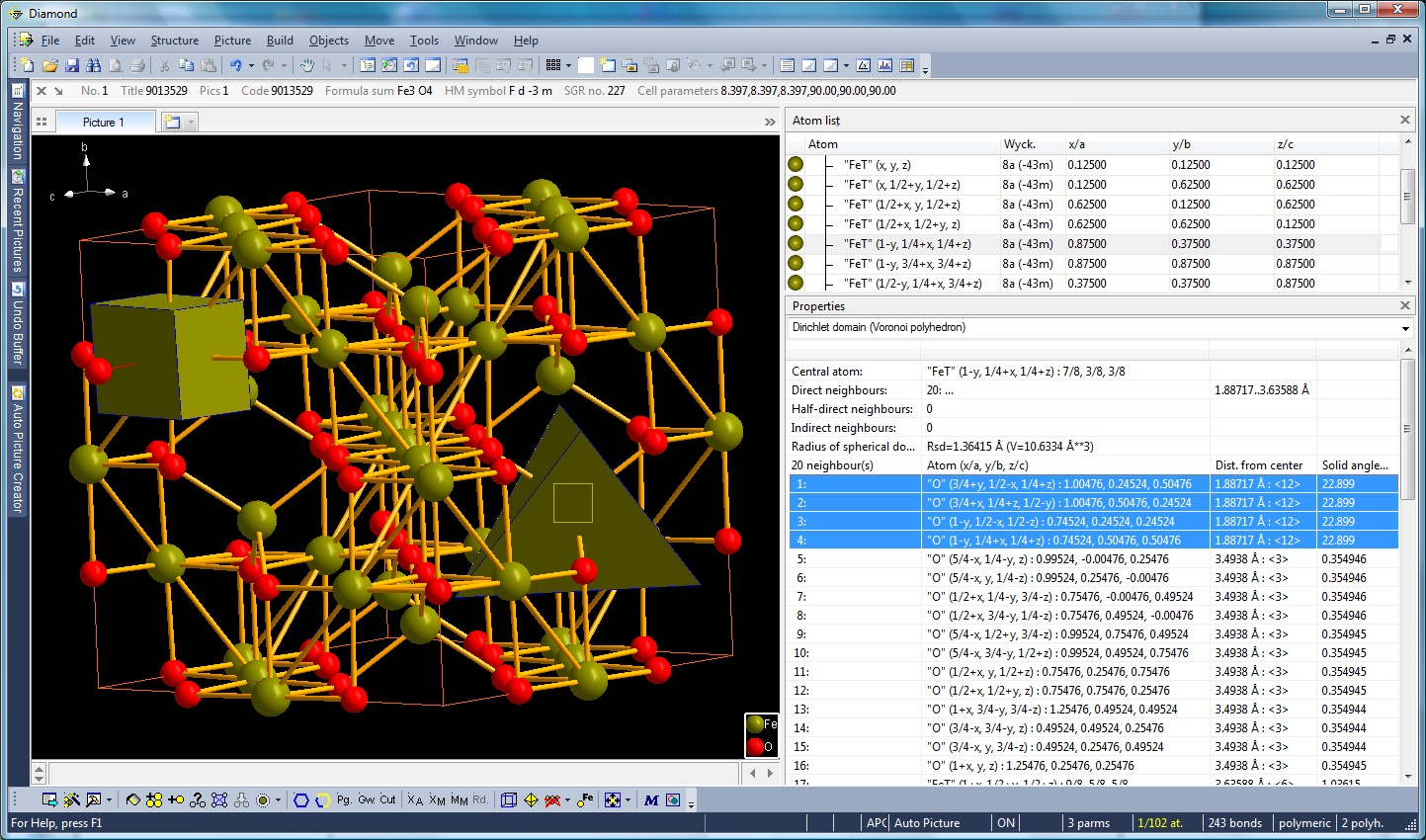 Screenshot (from Diamond version 4) with Voronoi polyhedra and Dirichlet domain of tetrahedrally coordinated iron in magnetite (COD:9013529) in Properties view (Full size image: 470 KB)
