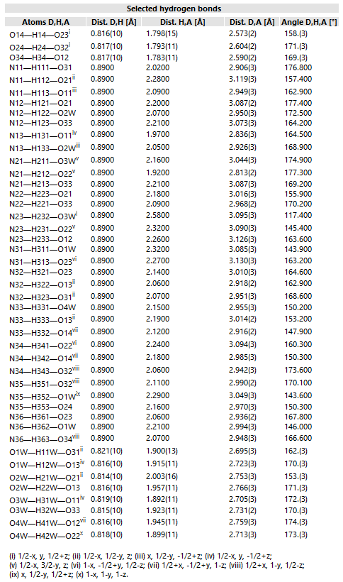 About reported H-bond infos At this place, we also mention the Reported H-bond infos, which typically come from "geom_hbond..." loops in a CIF file. For historical reasons, these H-bond infos appear twice in a Diamond structure data set - once as the mentioned "reported H-bond infos" and second as "connection parameters". A "reported H-bond info" contains three distance (dD,H, dH,A, dD,A) and one angle (D,H,A) information about the three atoms donor, H-atom, and acceptor. The "comprehensive" configuration of the data sheet lists the "reported H-bond infos" in the section "Selected hydrogen bonds" (see below), whereas the H-bond connection parameters are listed in the "H-bond parameters" section.
