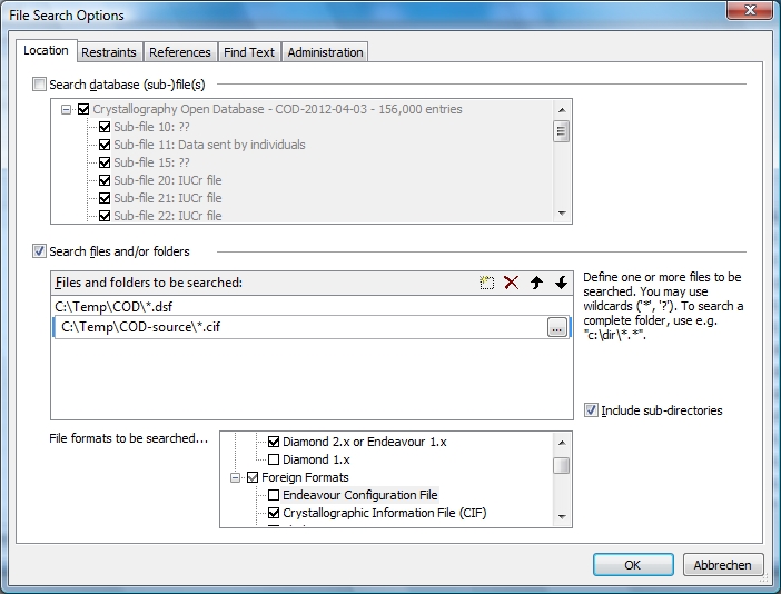 To define which files to search and what to search for, open the File Search Options dialog by clicking on the Search criteria... button. This dialog has multiple pages (tabs). The folders and file types to be searched are defined on the Location page of the dialog. Location page of the "File Search Options" dialog The lower half of this page refers to search of files on your hard disk. Set the checkmark in the checkbox "Search files and/or folders" to enable searching selected types of files in selected parts of your hard disk. Remove the checkmark in the checkbox "Search database (sub-)files", unless you want to extend the search to the database (COD), too. Set the checkmark in the checkbox "Search files and/or folders". Add paths and file masks in the list "Files and folders to be searched". The path/file mask typically uses the form "<drive><path>\*.<extension>" but it can also be e.g. "C:\xxx\Smith-G-????.cif". Specify if sub-directories of the listed paths are to be included in the search or not. Choose the file formats that may be considered during file search. Don't forget to adjust the file formats with the extensions used in the "Files and folders to be searched" list above.