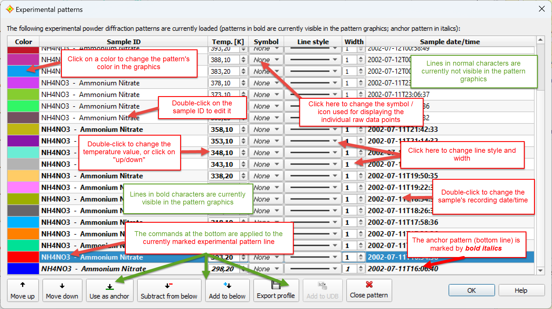 you can display a table of all currently loaded experimental diffraction patterns, along with
